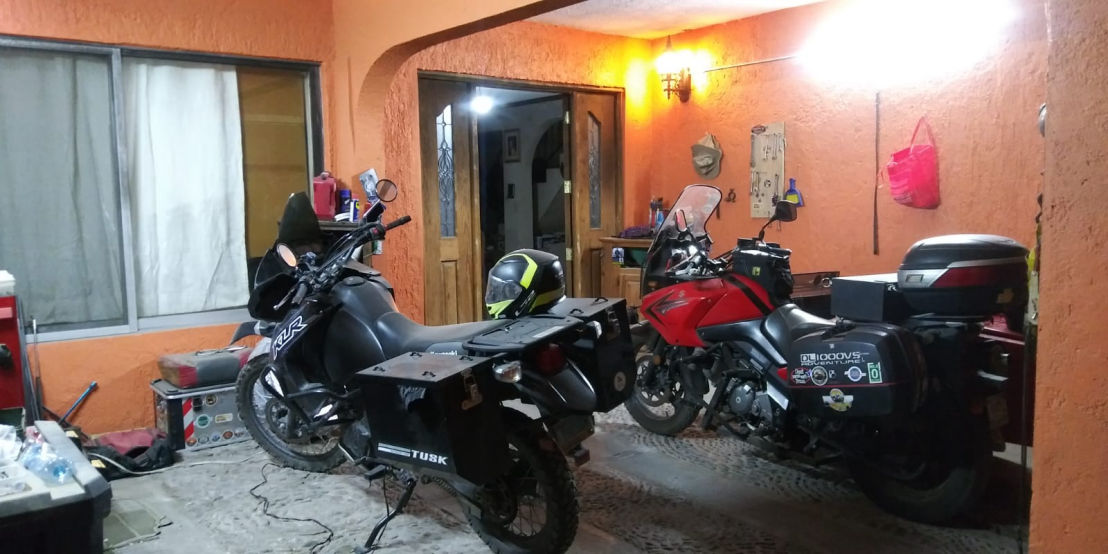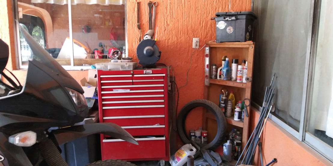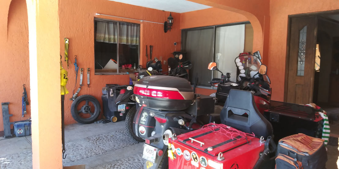 A fully covered well lit garage with room for 4 - 6 motorcycles, including tool boxes, electric plugs, etc. We can let you use our tools, but if you don't feel like working on your bike, we also have a genius, yet very affordable mechanic on stand by for you.